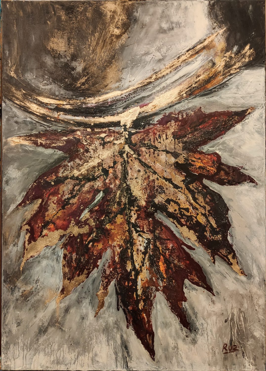 Senza avere a priori una vera precisa idea di cosa voler raffigurare, ma piuttosto visualizzandola man mano che la spatola scorreva sulla tela.